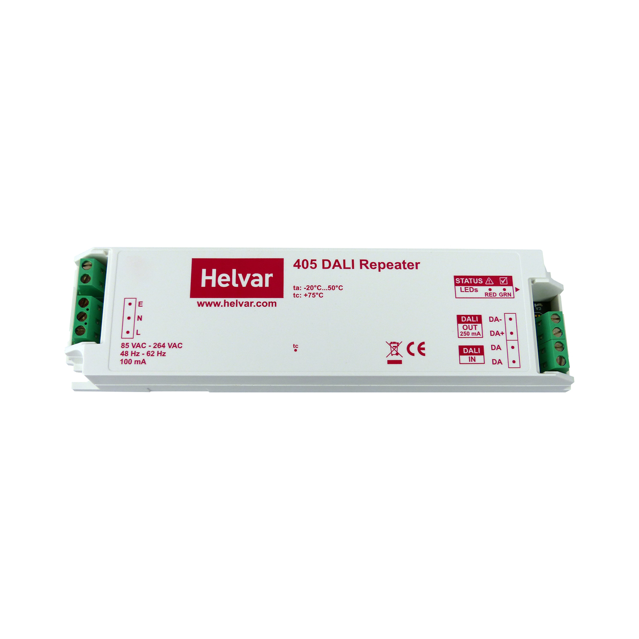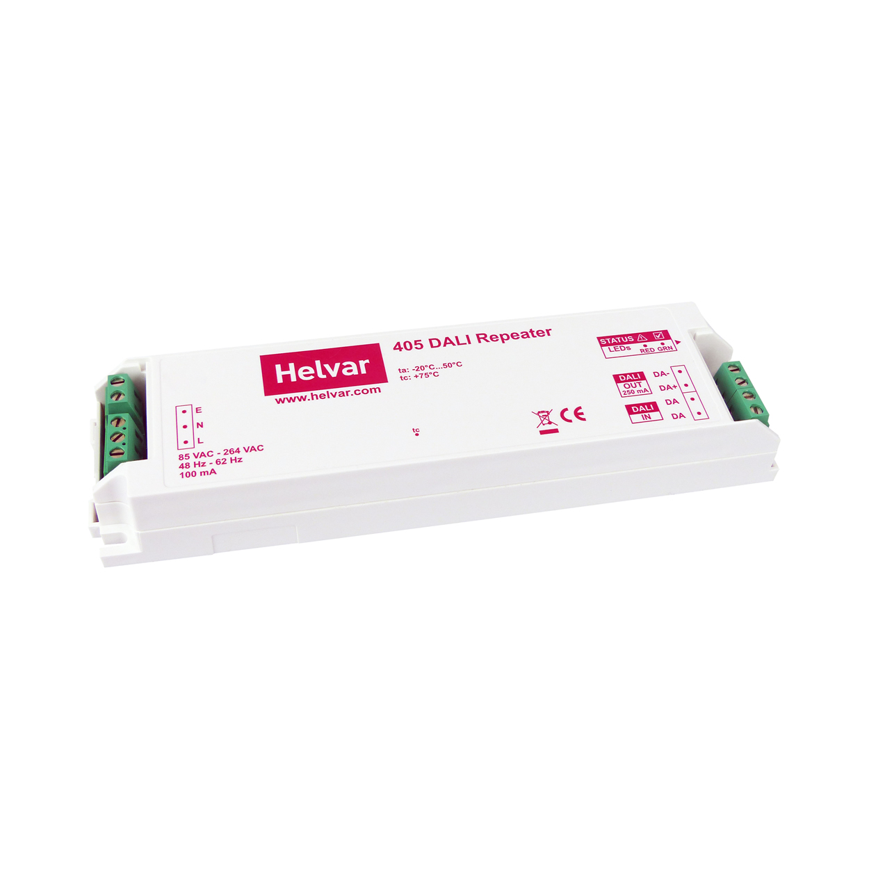 The DALI Repeater extends the maximum DALI line length from 300 m to 600 m and provides an additional 250 mA of DALI power. This device does not provide additional DALI addresses. The DALI limit of 64 addresses still applies.