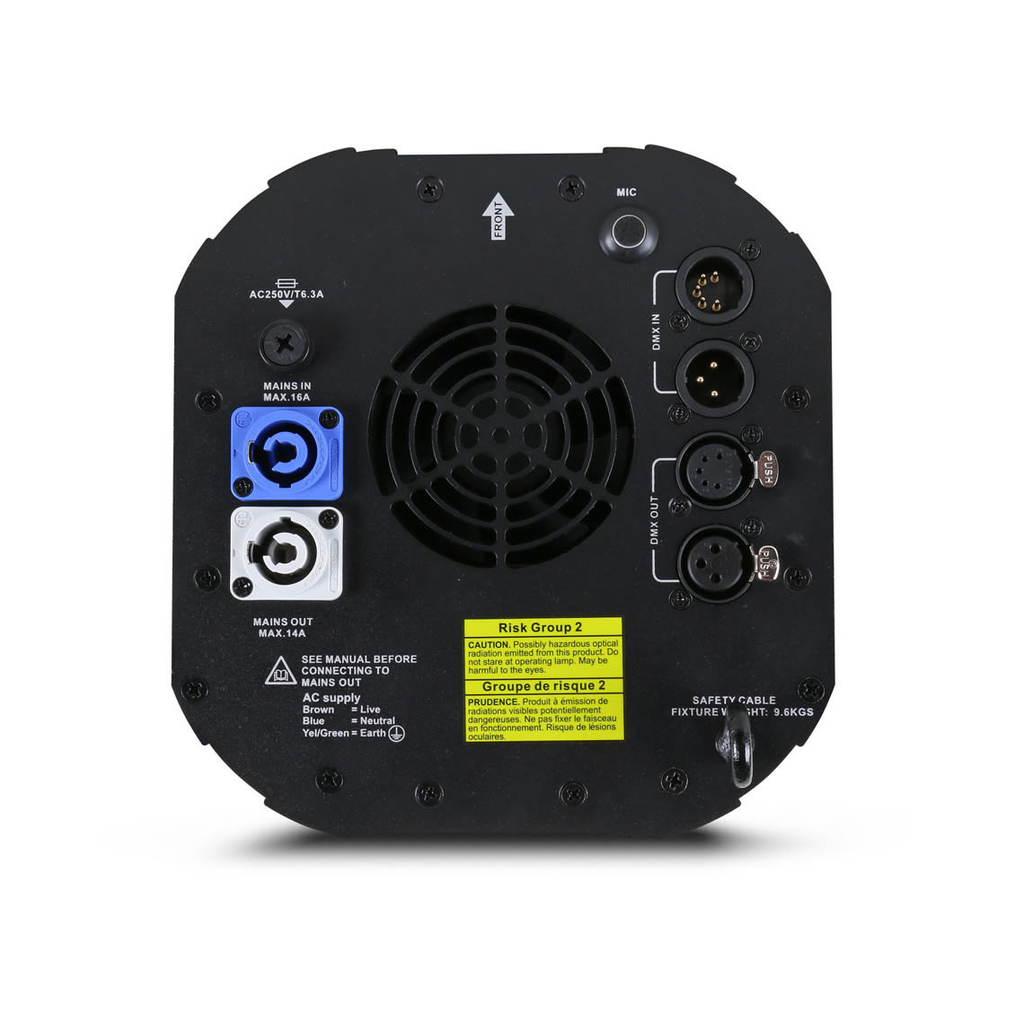 - Effects include two gobo wheels. two color wheels and a 3-facet prism